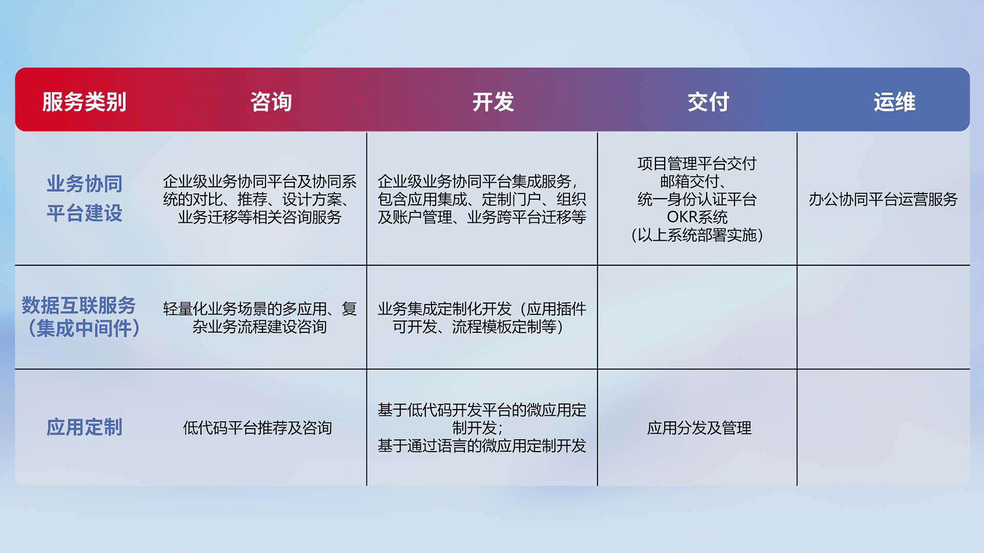 针对钉钉、、企微、、、、IDaas等平台级产品提供产品的规划、、、、方案、、、交付、、、、定制化开发等服务,,,,实现如统一协同办公、、、、智能客户服务、、、、混合会议管理、、智能数据查询、、、、等业务场景,,,实现数字化转型。。。。